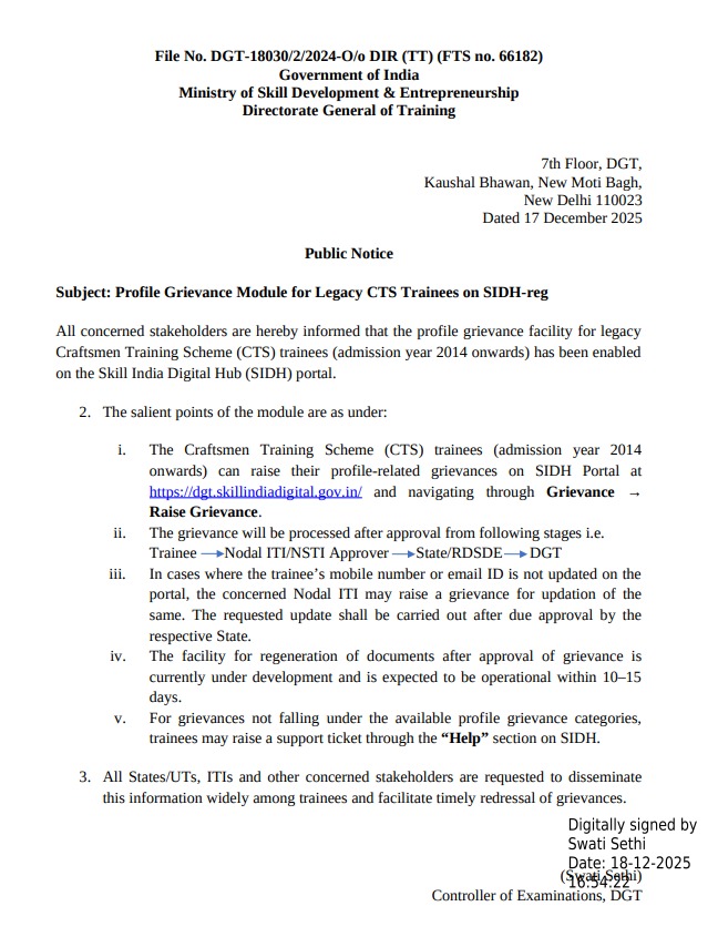 Public Notice og Profile Grievance(Admission Year 2014 Onwards) on SIDH Portal